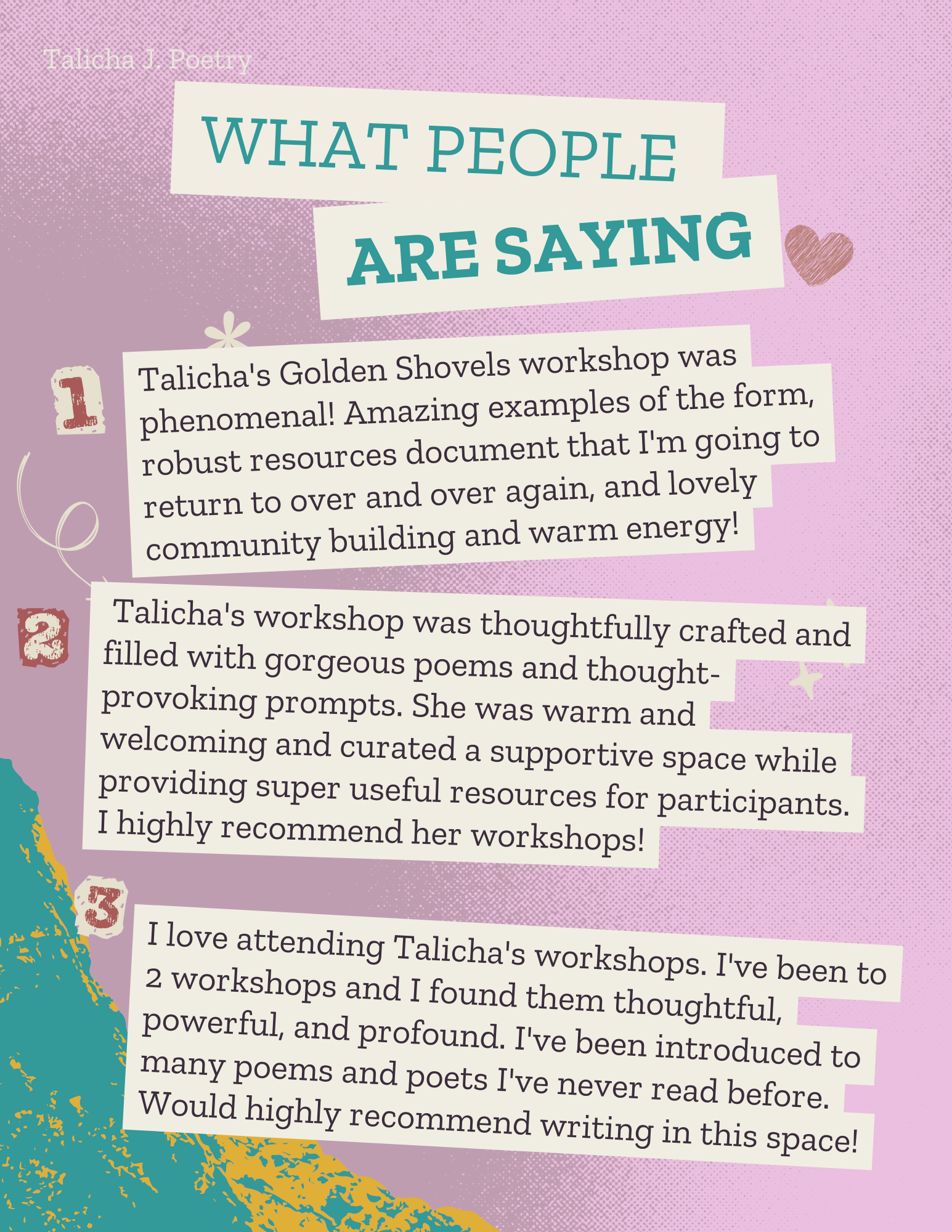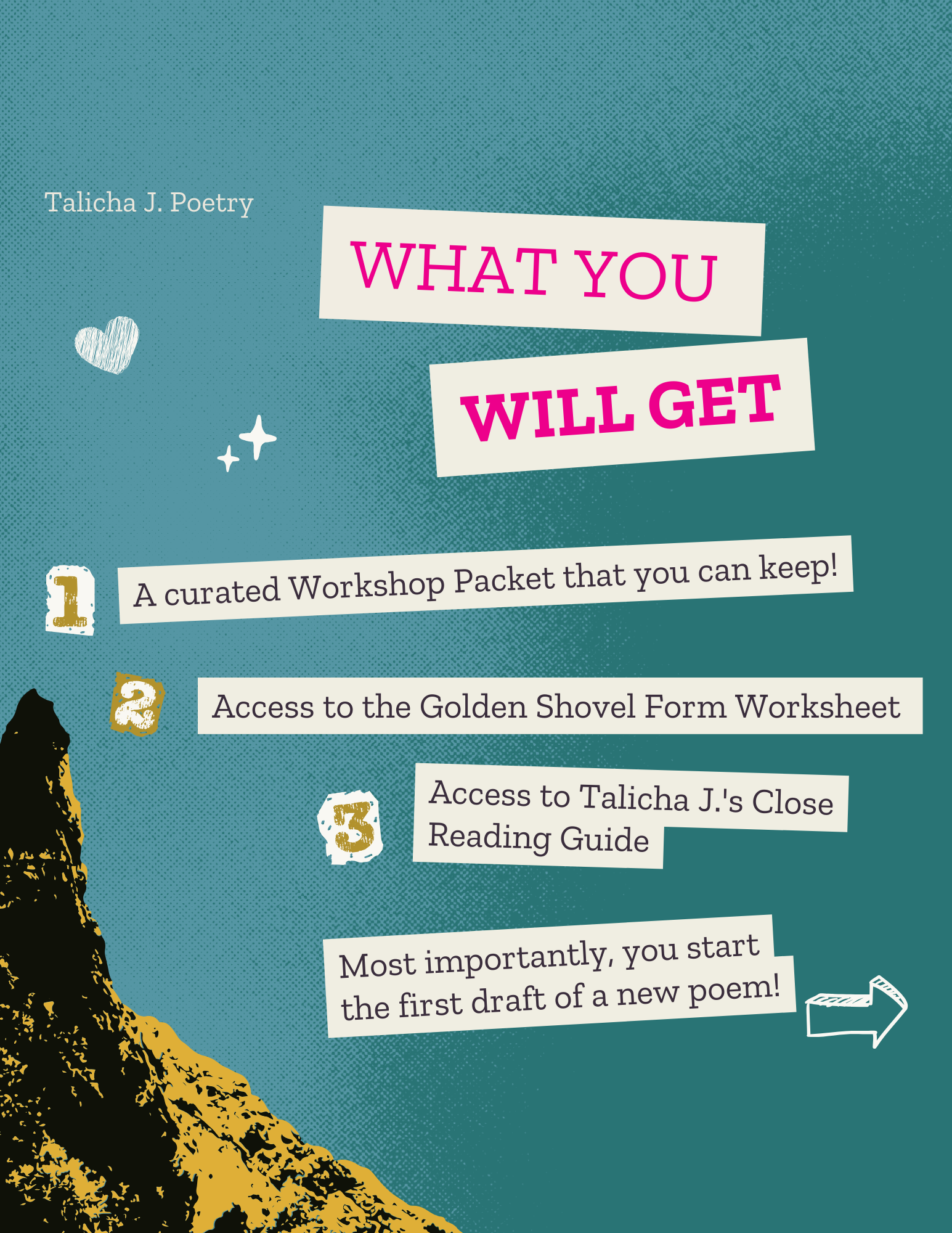 Workshops Categories: All Camp Physical Workshops Digital All / Chomp/Crack: Poems You Can Sink Your Teeth Into from $0.00 Select Make A Selection $0 - Sponsored Spot (No Payment Required) $40 - Help support access for other writers $30 - Help support access for other writers $25 - This is the standard cost of the workshop $20 - Available no questions asked for poets in need $8 - Workshop Packet: Access to the workshop materials only (no live session) Add To Cart Added! Refine the Roots: Poetry Revision Session $95.00 Sold Out Monday, February 9th — start anytime between 2:00pm–8:00pm EST Monday, February 16th — start anytime between 2:00pm-8:00pm EST Wednesday, February 18th — start anytime between 2:00pm–8:00pm EST Wednesday, February 25th — start anytime between 2:00–8:00pm EST Sunday, February 22nd — start anytime between 2:00–8:00pm EST Sold Out Added! Poem-odoro Sprints $5.00 Add to Cart Added! these pantoums are Black - MATERIALS ONLY $8.00 Add To Cart Added! Black & Golden Shovels: An Homage to Form in Black Poetics Workshop Materials ONLY $8.00 Add To Cart Added! Revision Roundtable (Returning in 2026!) from $25.00 Sold Out View Options