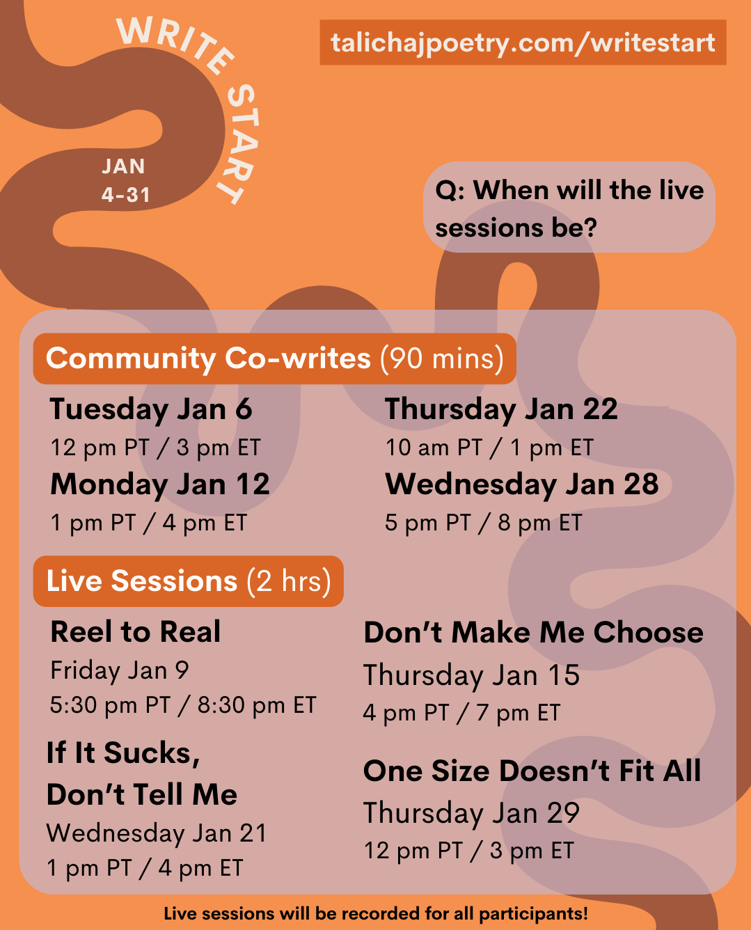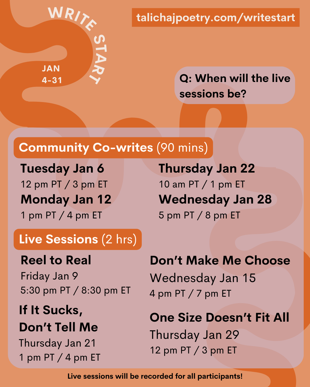 Write Start is a generative space, not a critique workshop. Sharing is welcome, but there is no formal feedback requirement.What if I can’t start on January 4th or join late?